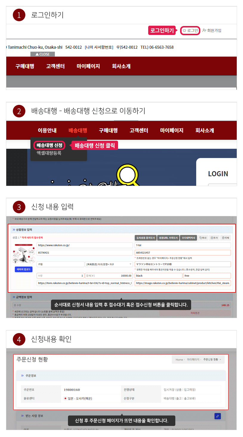 2) 쇼핑몰에서 한번에 결제한 상품은 모두 한 배송대행 신청서에 입력하여 신청하셔야 합니다. * 상품이 1개라도 물류센터에 도착하면 신청서 수정이 불가능합니다.